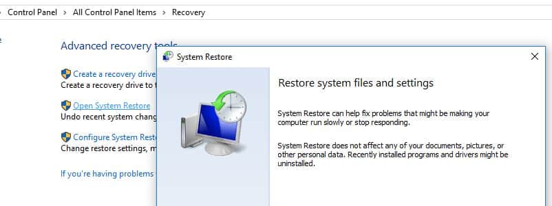 - 點擊打開系統恢復器e 並按照說明選擇錯誤開始之前的還原點並繼續還原。