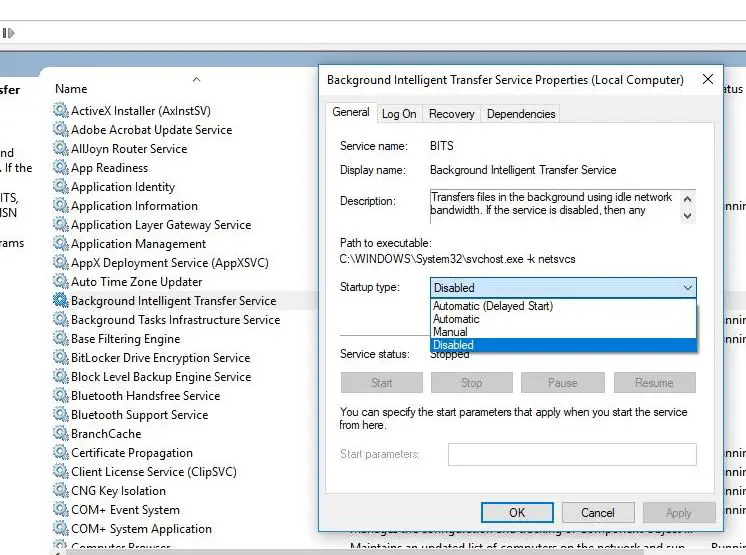 第一個媒體win + r然後輸入Services.MSC並點擊Enter鍵。現在,這將打開Windows Services現在向下滾動並尋找背景智能傳輸服務雙擊它。當屬性時,彈出窗口將打開更改啟動類型以禁用。並停止服務狀態下的服務。