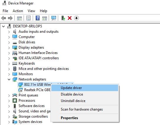 - 找到並展開網絡適配器部分,右鍵單擊 WiFi 適配器並選擇更新驅動程序,