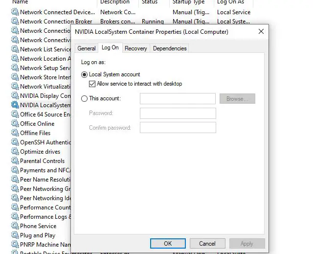此外,移至“登錄”選項卡並選中“允許服務與桌面交互”,然後單擊“應用”,然後單擊“確定”。對其他 NVIDIA 服務執行相同操作,以允許 NVIDIA 驅動程序服務與本地帳戶交互。