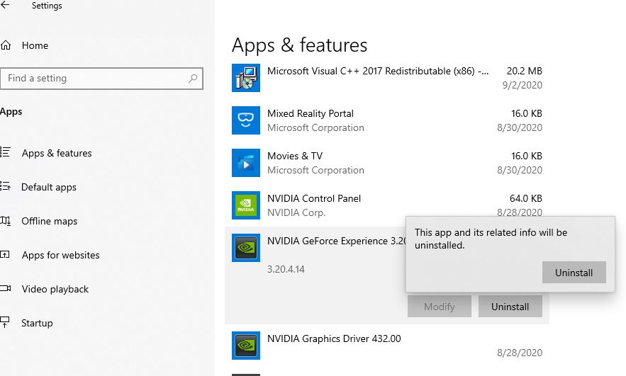- 按照屏幕上的說明從您的設備中卸載 GeForce Experience。