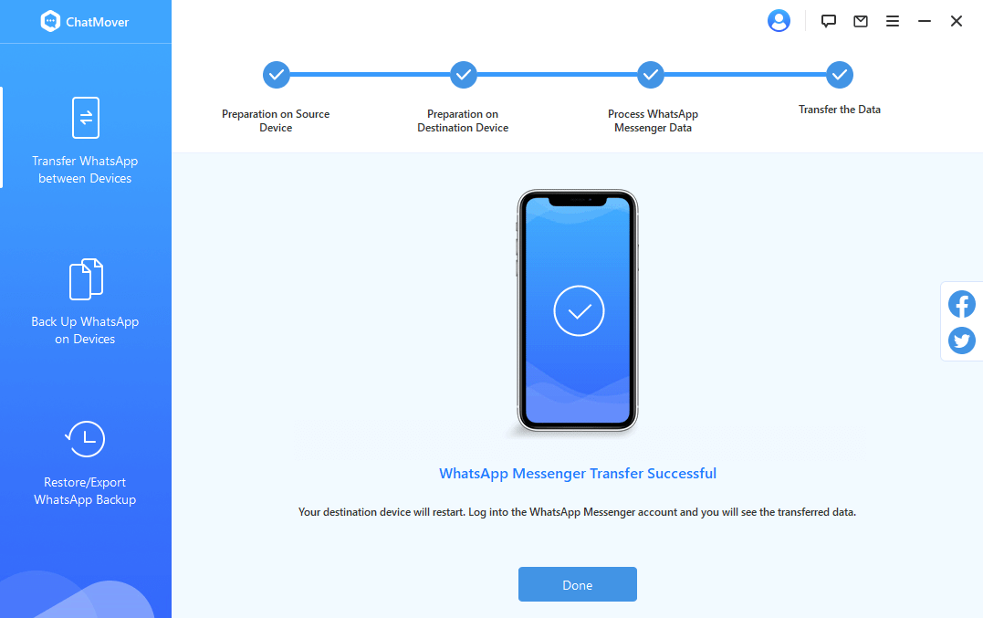 - 只需幾分鐘即可傳輸 WhatsApp 數據。