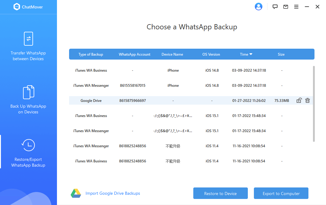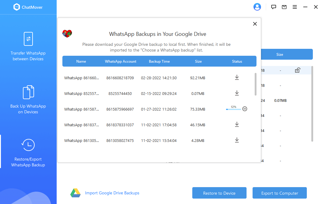 ChatMover 是人們用來直接從 Google 雲端硬盤下載 WhatsApp 備份文件的應用程序之一。請按照以下步驟操作,了解如何使用 ChatMover 將 WhatsApp 備份從 Google 雲端硬盤下載到您的計算機。