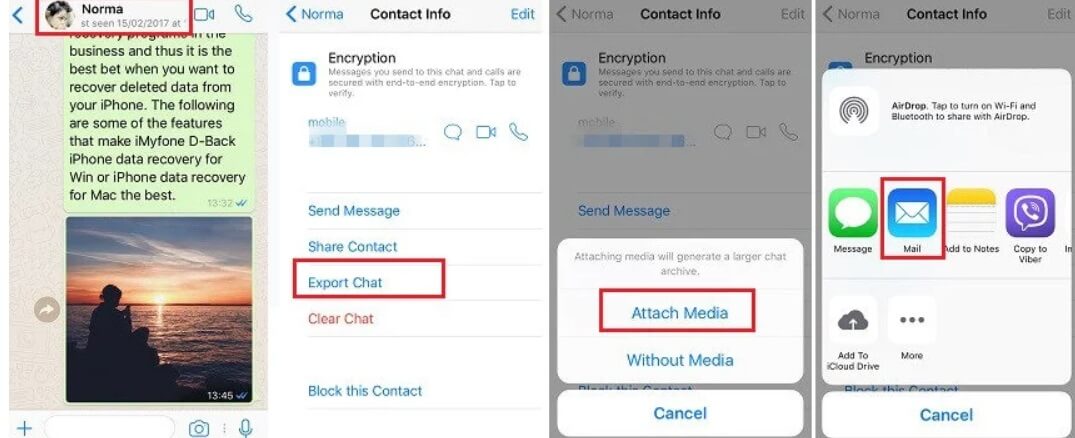 您可以將 iPhone 上的個人 WhatsApp 聊天內容通過電子郵件發送到您的計算機。但是,如果您有幾條 WhatsApp 消息需要備份,則此方法適用,因為您一次只能備份一條聊天記錄。請記住這一點,以下是如何通過電子郵件將 WhatsApp 備份到您的電腦。