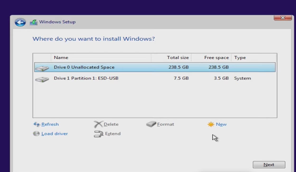 - 創建分區後,選擇要安裝 Windows 的驅動器,然後單擊下一步。