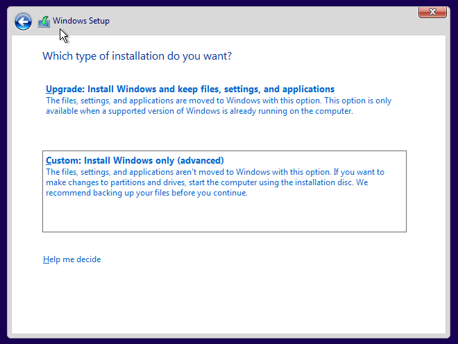 - 因為我們想要新鮮或全新安裝 Windows 10,選擇自定義安裝。另外,如果您是,則需要選擇此選項在新硬盤上安裝 Windows 10