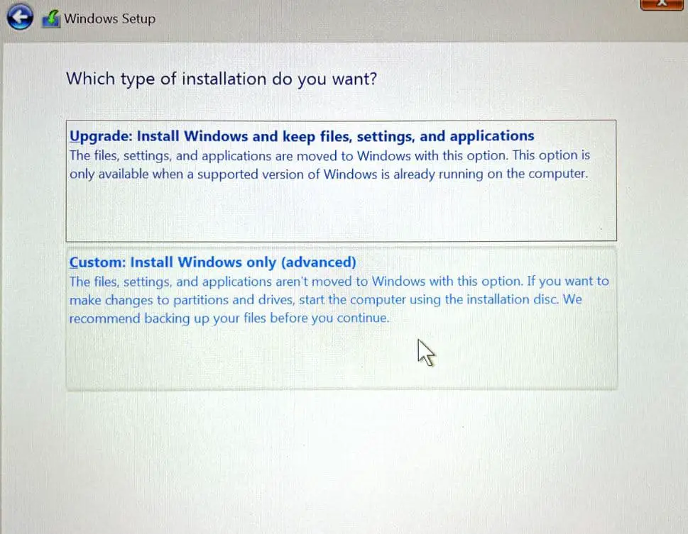 - 選擇自定義:僅安裝 Windows(高級)執行全新安裝。
