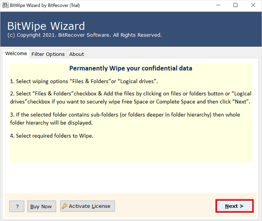 BitRecover 數據擦除工具是一種自動化、簡單、快速的方法,可以安全地釋放 C 驅動器空間,而不會丟失操作系統。它是全球數百萬用戶選擇的行業工具,只需點擊幾下即可擦除 C 驅動器。立即下載該工具。演示版本可免費刪除 C 驅動器中的所有內容。