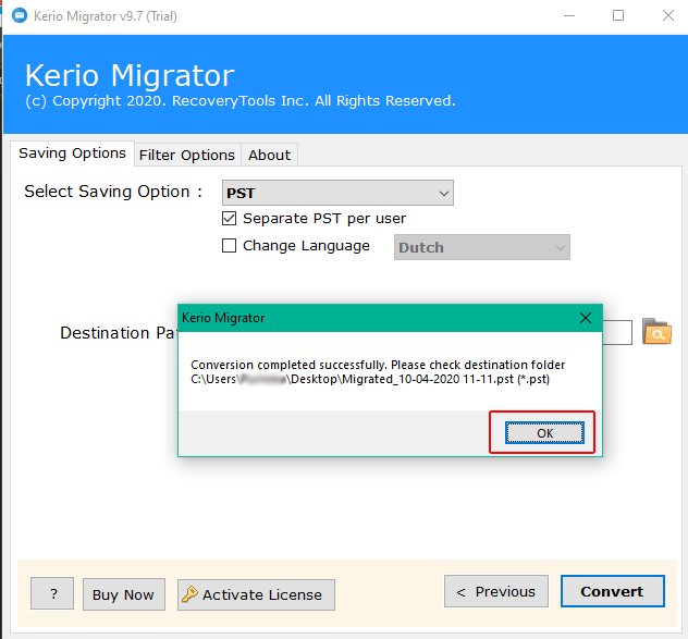 最後,按轉變選項卡開始 Kerio 到 Outlook 的轉換。