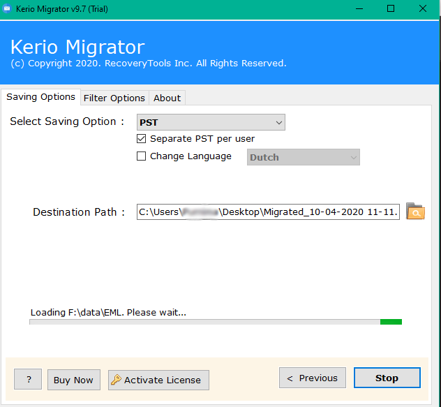 居住 轉換進度報告:該工具提供了通過實時轉換報告分析 Kerio 到 Outlook 傳輸過程的效率的選項。