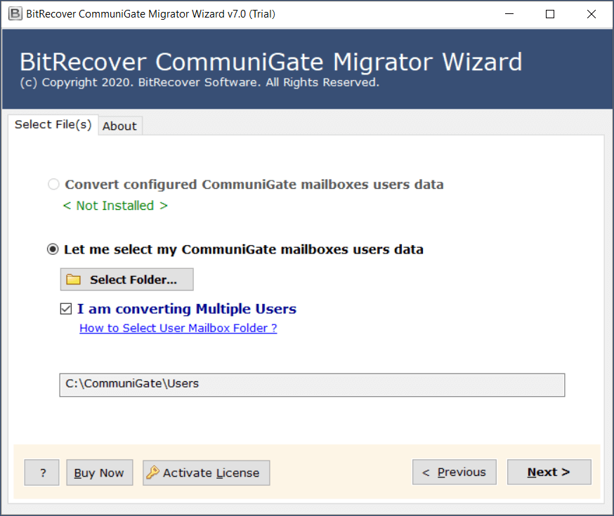 (b)選擇文件夾:如果選擇此選項,您可以上傳包含 Kerio 電子郵件的文件夾。屏幕將顯示轉換多個用戶並啟用此選項“我正在轉換多個用戶”。
