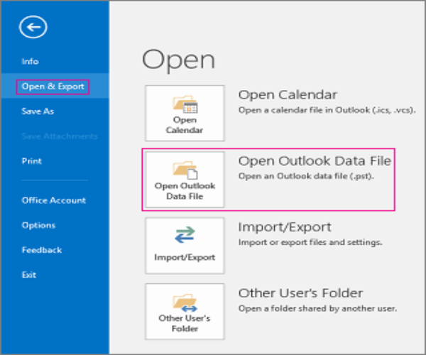 就是這樣!現在,您已經有了 PST 文件,只需打開您的 Outlook 電子郵件客戶端用於導入數據。您可以通過這種方式完成此導入過程 -打開和導出 >> 打開 Outlook 數據文件