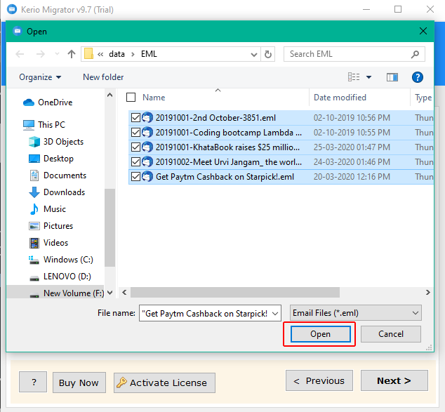 導入數據的雙重選項:該軟件帶有雙文件選擇選項,用於將數據上傳到 GUI。現在,您可以將單個文件或文件夾的 Kerio 轉換為 PST。