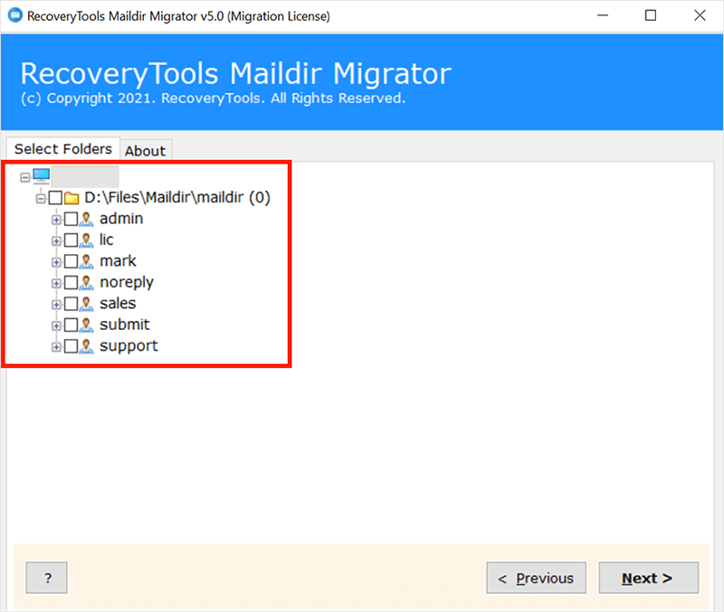- 現在使用選擇文件選擇 Maildir 文件和文件夾,然後選擇文件夾選項。