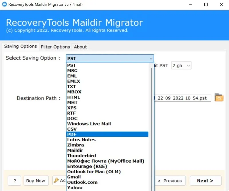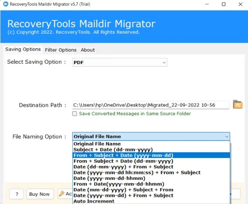 該軟件支持所有版本的 Adobe Acrobat Reader。該工具提供多種文件命名轉換選項,以便用戶可以以專業的方式管理生成的 Adobe PDF 文檔,將 Maildir 轉換為 PDF 格式。