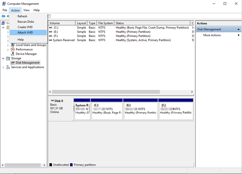 步驟1。打開磁盤管理實用程序並打開操作 >> 附加 VHD 文件選項。