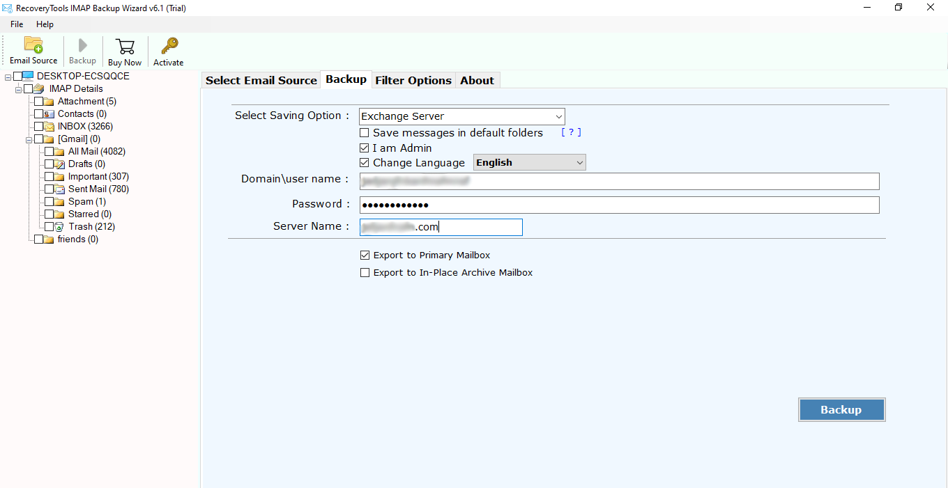 該工具包還提供選擇性地將 IMAP 文件夾轉換為 Exchange Server 的功能。為此,請選中以下框“使用高級設置進行選擇性備份”。