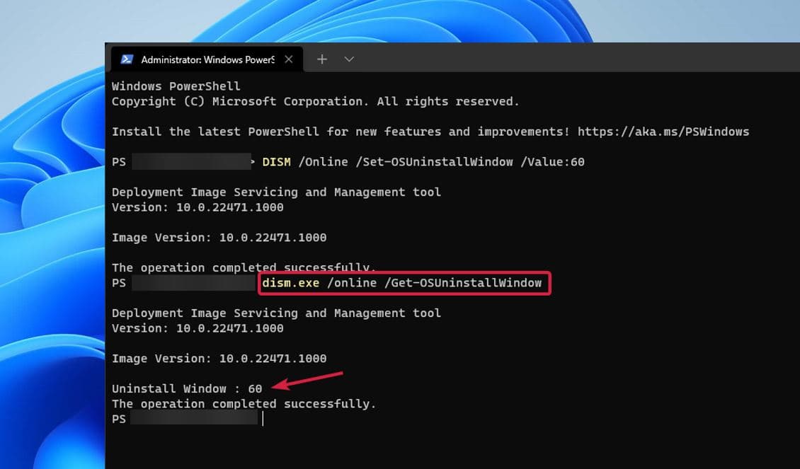 - 接下來,運行命令DIMS /在線 /set-osuninstallwindow /value:50延長Windows 11回滾時間50天。您可以用您的電話替換50個。