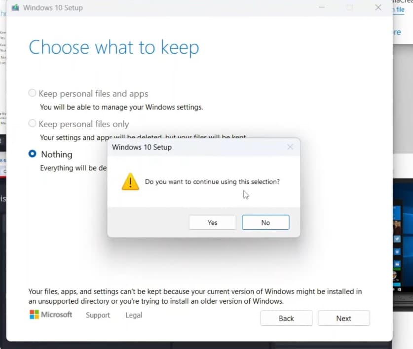 接下來,您必須在“選擇要保留的內容”屏幕上選擇“無””,然後單擊“是”按鈕以確認選項。 Windows將刪除您的整個系統驅動器,包括您的個人文件。確保您可以備份重要文件。