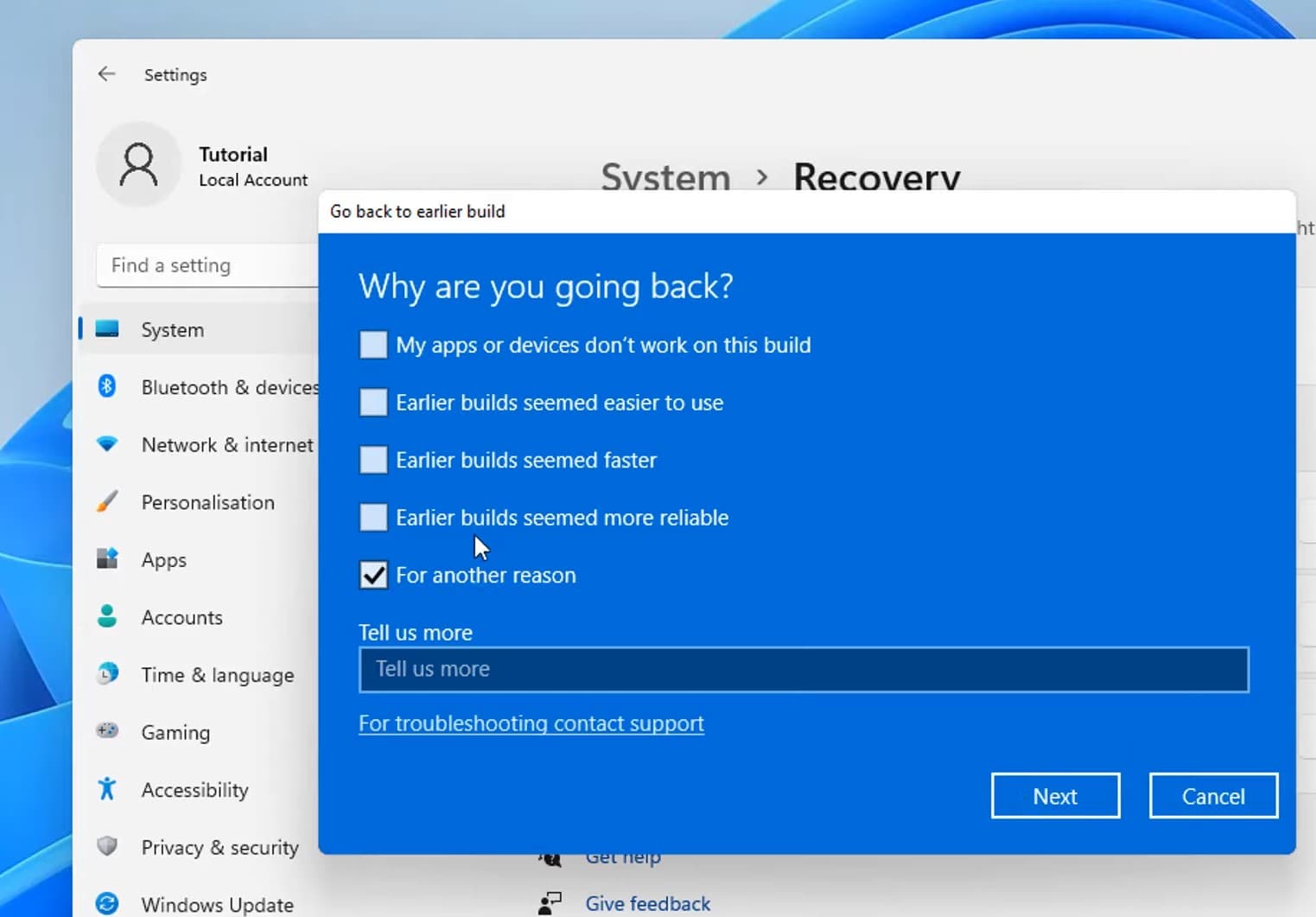 接下來,您將被問到為什麼要返回Windows 10。從列表中選擇一個選項,然後單擊“下一步”。這將有助於Microsoft將來改善Windows 11。