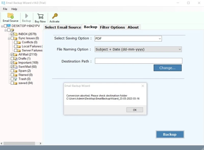 - 單擊備份按鈕將 Hotmail 電子郵件下載到您的 PC。