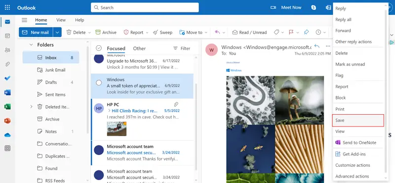 - 重複使用相同的步驟將另一封電子郵件從 Hotmail 保存到計算機。