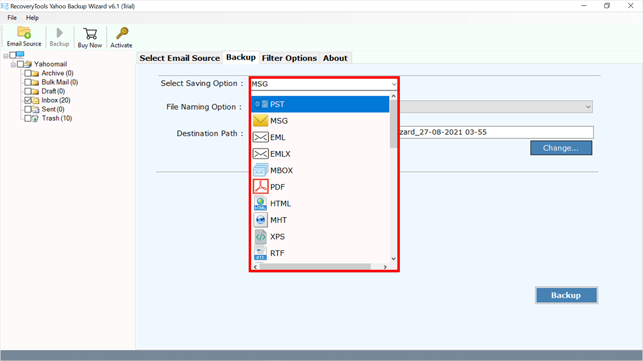 • 此外,它還可以將 Yahoo 電子郵件導出到 MBOX、Office 365、Yahoo、PDF、DOC、EML 等。