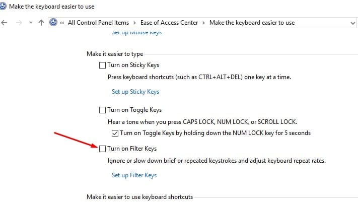 - 向下滾動並找到過濾鍵選項。確保打開篩選鍵選項是未檢查。