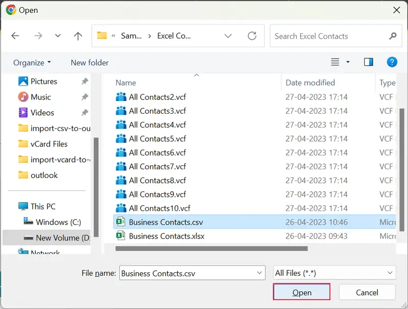 - 選擇轉換後的聯繫人文件並選擇打開按鈕繼續。