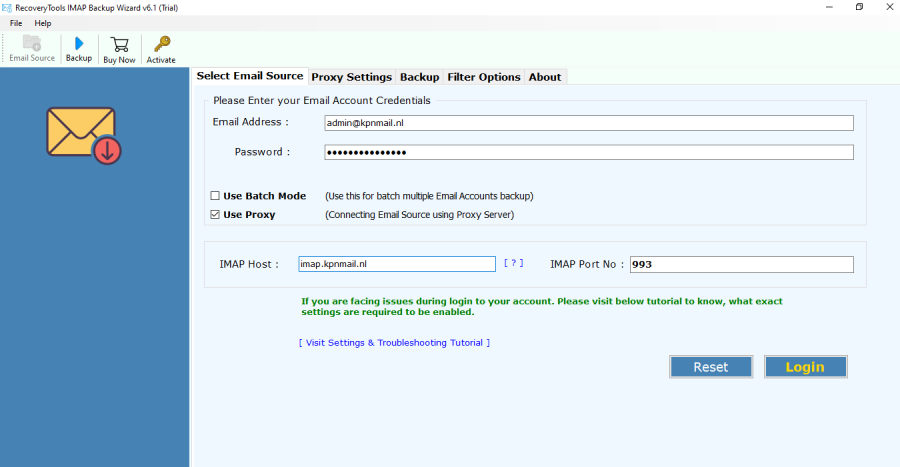 啟動軟件後,輸入 KPN 郵件帳戶的電子郵件地址和密碼。輸入 IMAP 主機 -imap.KPNmail.nl和端口號-993。點擊登入開始任務。