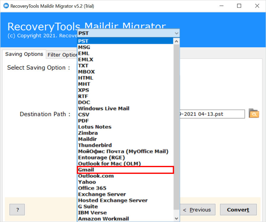 - 現在按“選擇保存選項”並選擇“郵箱”從列表中將 Maildir 遷移到 G Suite。