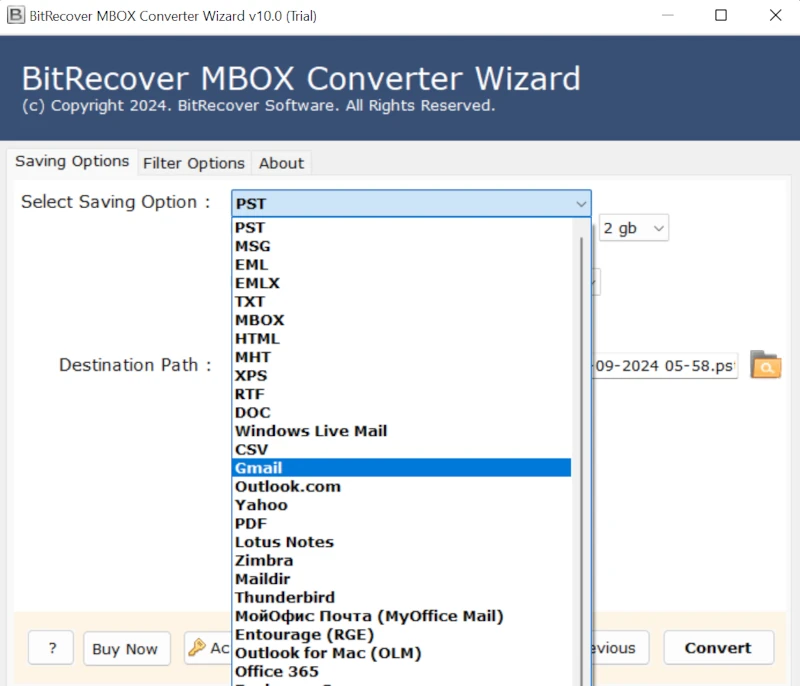 - 之後,選擇“保存選項“ 作為 ”郵箱”從下拉菜單中將 MBOX 導入 Gmail。