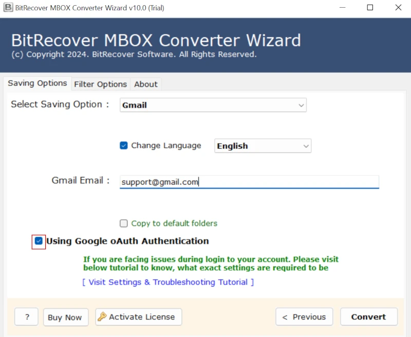 筆記: -這款專家推薦的引人注目的功能MBOX 到 Gmail 導入程序是它適用於最新的OAuth認證機制。用戶可以流暢地使用此功能來加快 MBOX 導入過程。