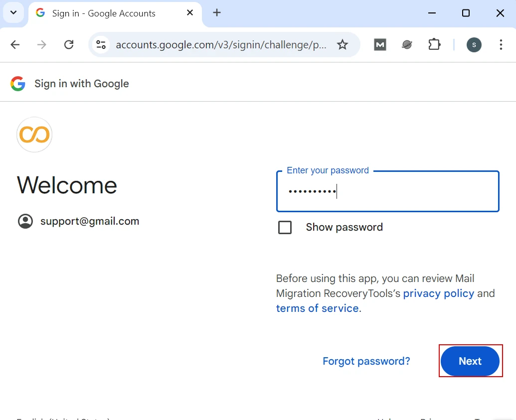- 最後,輸入密碼並單擊繼續彈出窗口中的按鈕啟動將 MBOX 文件上傳到 Gmail 的過程。