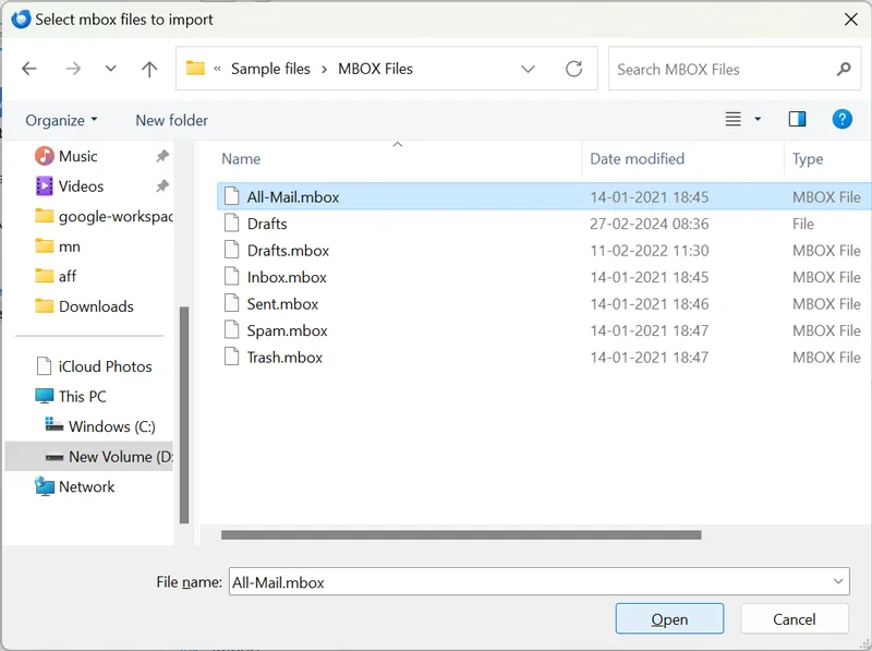 - 選擇您需要從 PC 導入的 MBOX 文件並單擊“打開”。