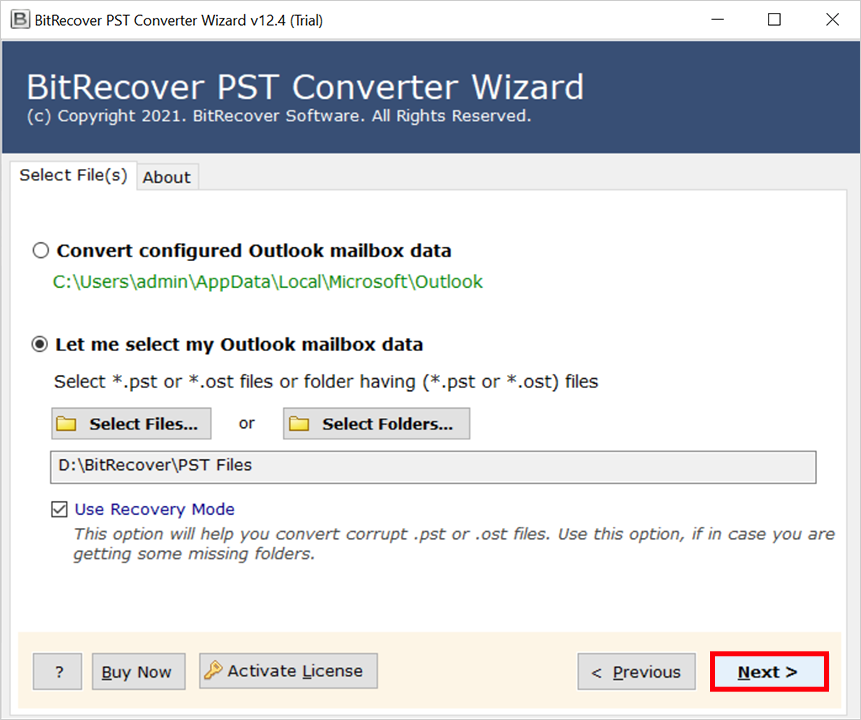 - 添加 Outlook PST 文件在軟件中使用雙模式因此。