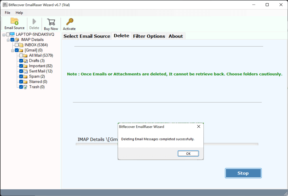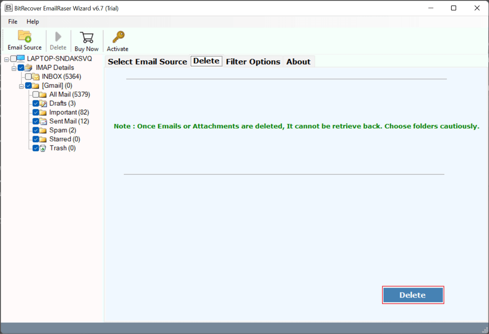 - 之後,按刪除按鈕從軟件面板到批量刪除 Gmail 上的電子郵件。