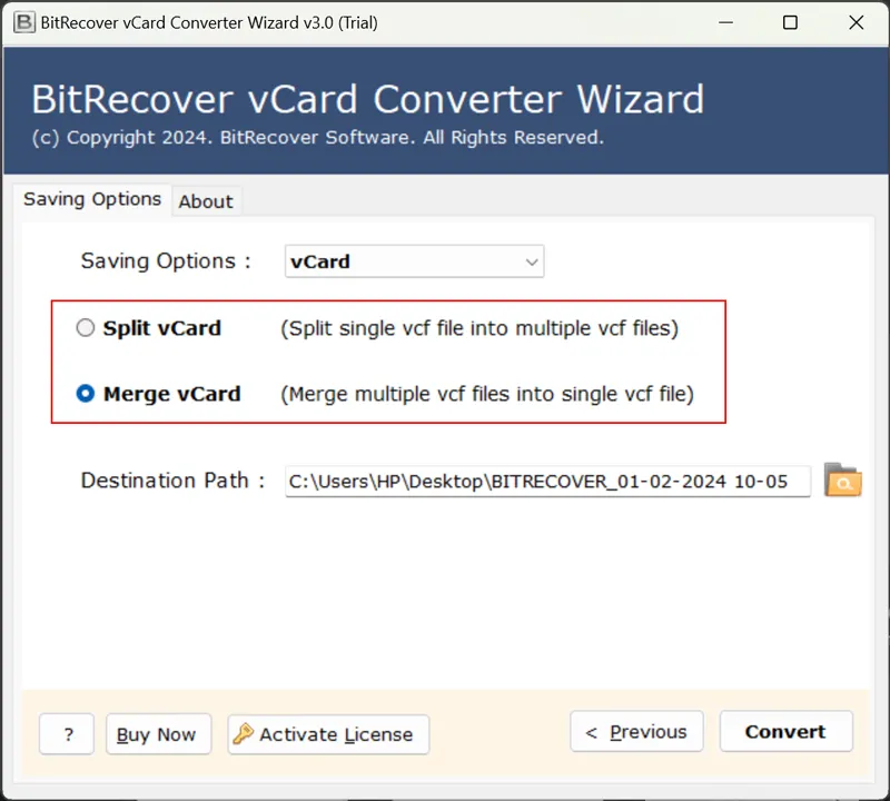 BitRecover vCard Converter Wizard 是一款優秀的軟件,可讓您將多個 VCF 文件合併為一個。此 vCard 合併軟件允許您將 VCF 轉換為 vCard。您可以啟用“合併 vCard”選項,將 VCF 文件合併為一個包含 100% 準確度的完整關鍵信息的 VCF 文件。