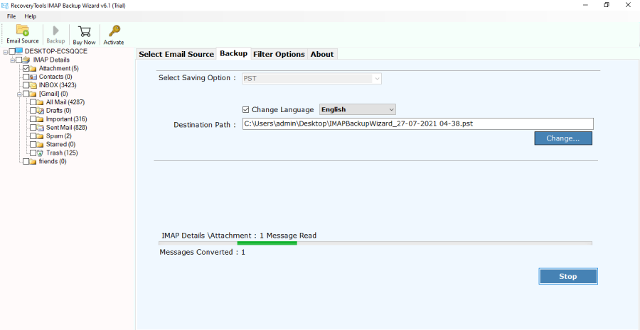 免費版本允許將前 25 個電子郵件項目從 Hostinger 遷移到 PST 格式。