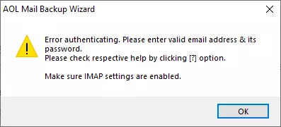 如果你是看到錯誤驗證消息然後確保 IMAP 設置已啟用。請按照以下說明操作啟用 IMAP 和不太安全的設置– https://www.bitrecover.com/blog/generate-aol-mail-app-password/
