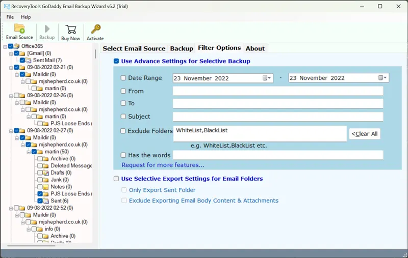 - 高級過濾器選項:此功能使用戶能夠通過日期範圍、收件人、發件人、主題等移動特定電子郵件。用戶還可以排除不需要的文件夾,如垃圾郵件、已刪除郵件、垃圾郵件等。