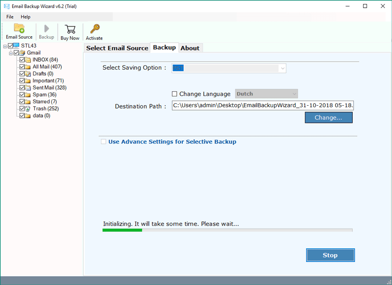 最後,點擊備份按鈕。將 Telus 電子郵件遷移到 Outlook 的過程已成功啟動。轉換結束後,轉到保存 PST 文件的輸出文件夾。