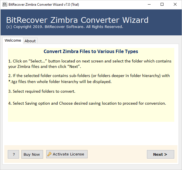 - Zimbra ZDB 轉換器– 如果您沒有 Zimbra 導出的 TGZ 文件,則應該使用上述軟件。 Zimbra 還創建 ZDB(Zimbra 數據庫)文件以將其數據存儲在默認存儲位置。因此,在沒有 TGZ 文件的情況下將 Zimbra 遷移到另一台服務器是有用的軟件。