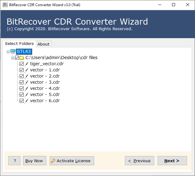 從數據庫中搜索 .cdr 文件並將其加載到軟件面板中。有兩種選擇:“選擇文件“ 和 ”選擇文件夾”選項。您可以一次打開多個CDR文件進行轉換。
