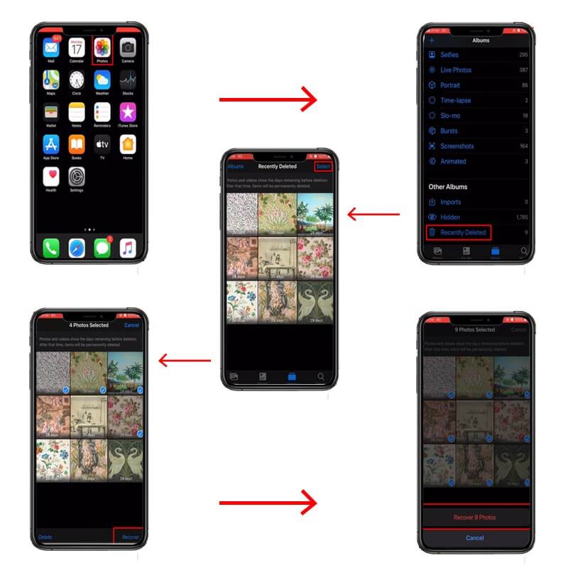 如果您從iPhone中刪除了照片並將其存儲在最近刪除的文件夾中,則可以使用以下步驟快速恢復它們: