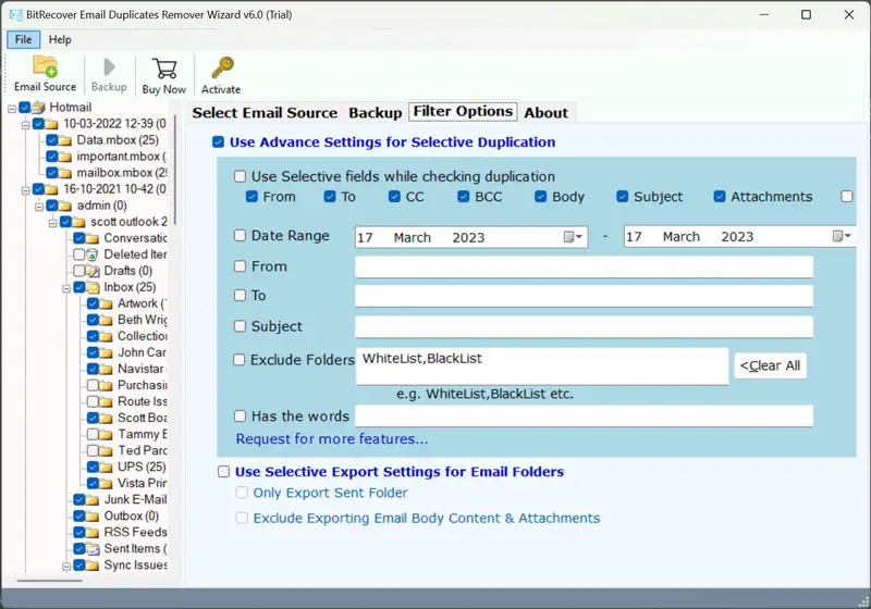 - 指定日期範圍,時間,年,主題,電子郵件ID,文件夾,收件箱,發送,草稿,所有郵件,垃圾和垃圾郵件,以刪除所需的重複電子郵件。