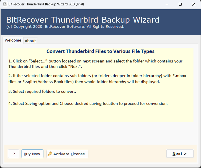 儘管有多種手動方法可以從 Thunderbird 導出所有電子郵件,但是,所有方法都存在我們討論過的主要缺點。為了解決所有手動問題,我們的軟件工程師開發了一種自動化工具,以超越手動方法的所有問題。這BitRecover Thunderbird 備份嚮導旨在將 Thunderbird 的所有電子郵件保存為 30 多種保存格式,包括 MBOX、EML、PST、MSG、PDF、DOC、CSV 等。