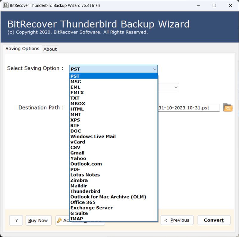 - 該工具提供 30 多個保存選項,允許用戶將 Thunderbird 轉換為 PST、EML、MSG、PDF,或將 Thunderbird 文件傳輸到 Office 365、Outlook、Yahoo、Zimbra 等。