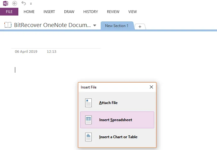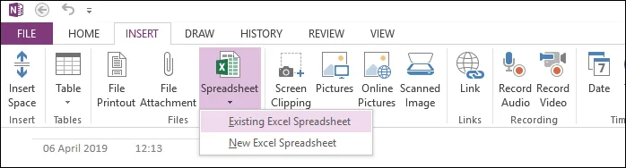 - 跑步微軟OneNote並選擇插入>>試算表>>現有 Excel 電子表格選項。