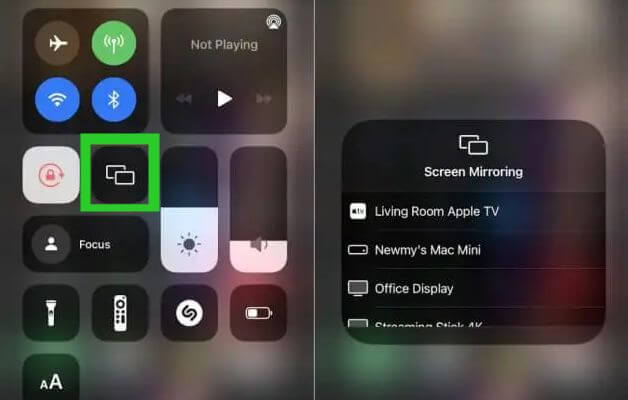 控制中心(或在舊款 iPhone 上從底部邊緣向上滑動)。 - 點擊“屏幕鏡像”或“AirPlay”圖標。